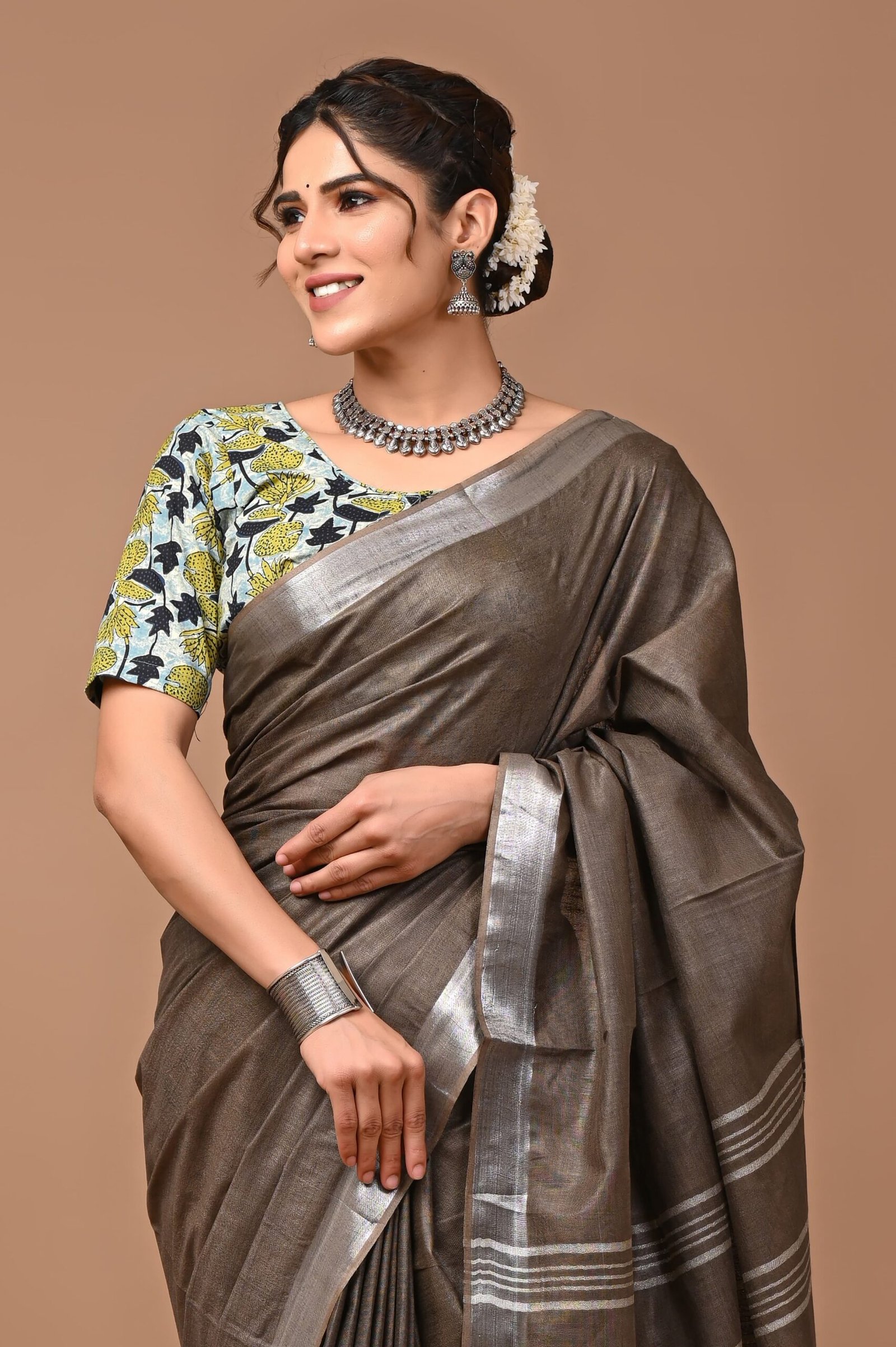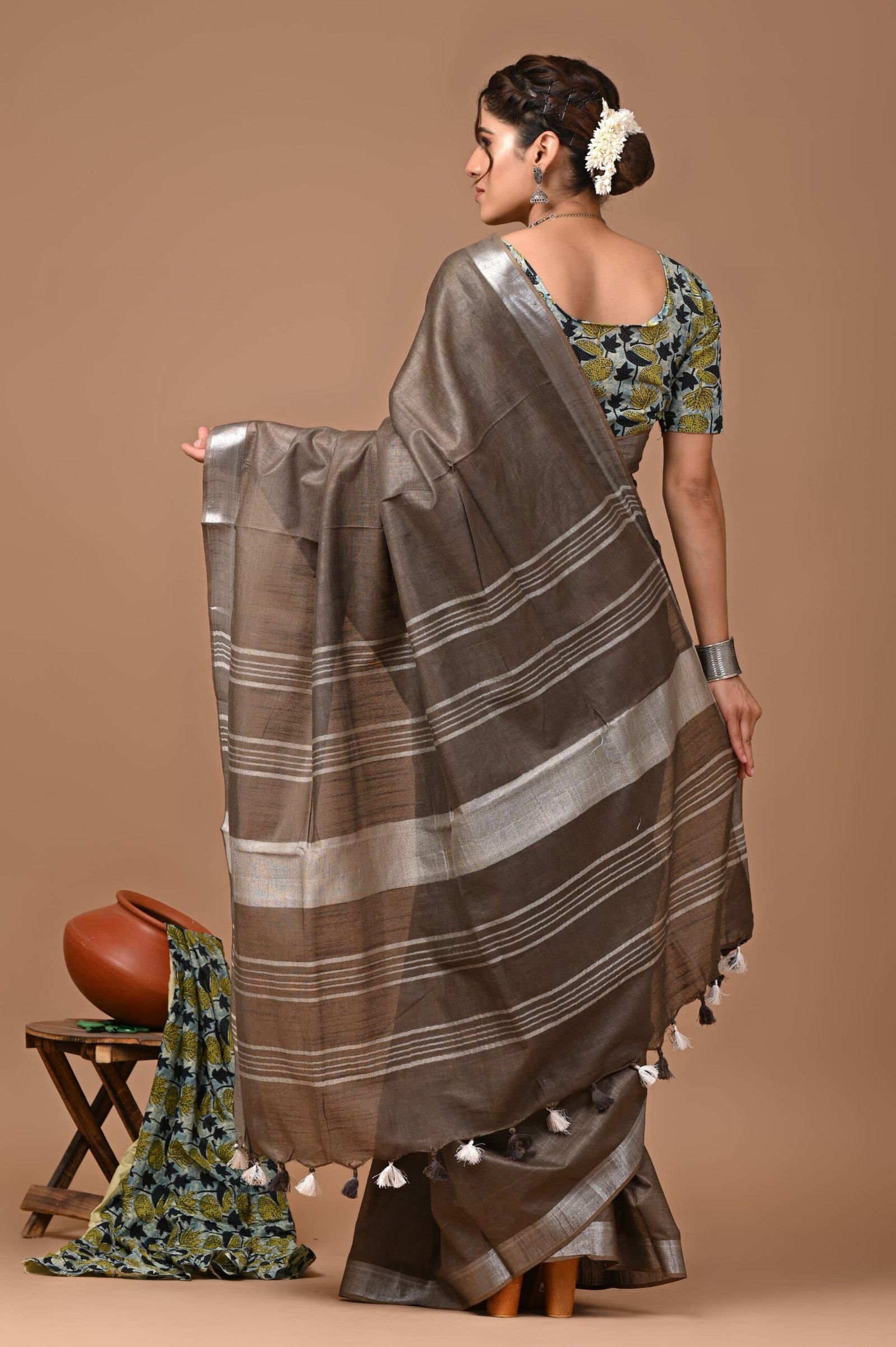 Charcoal Brown Cotton Linen Saree with Silver Zari Pallu