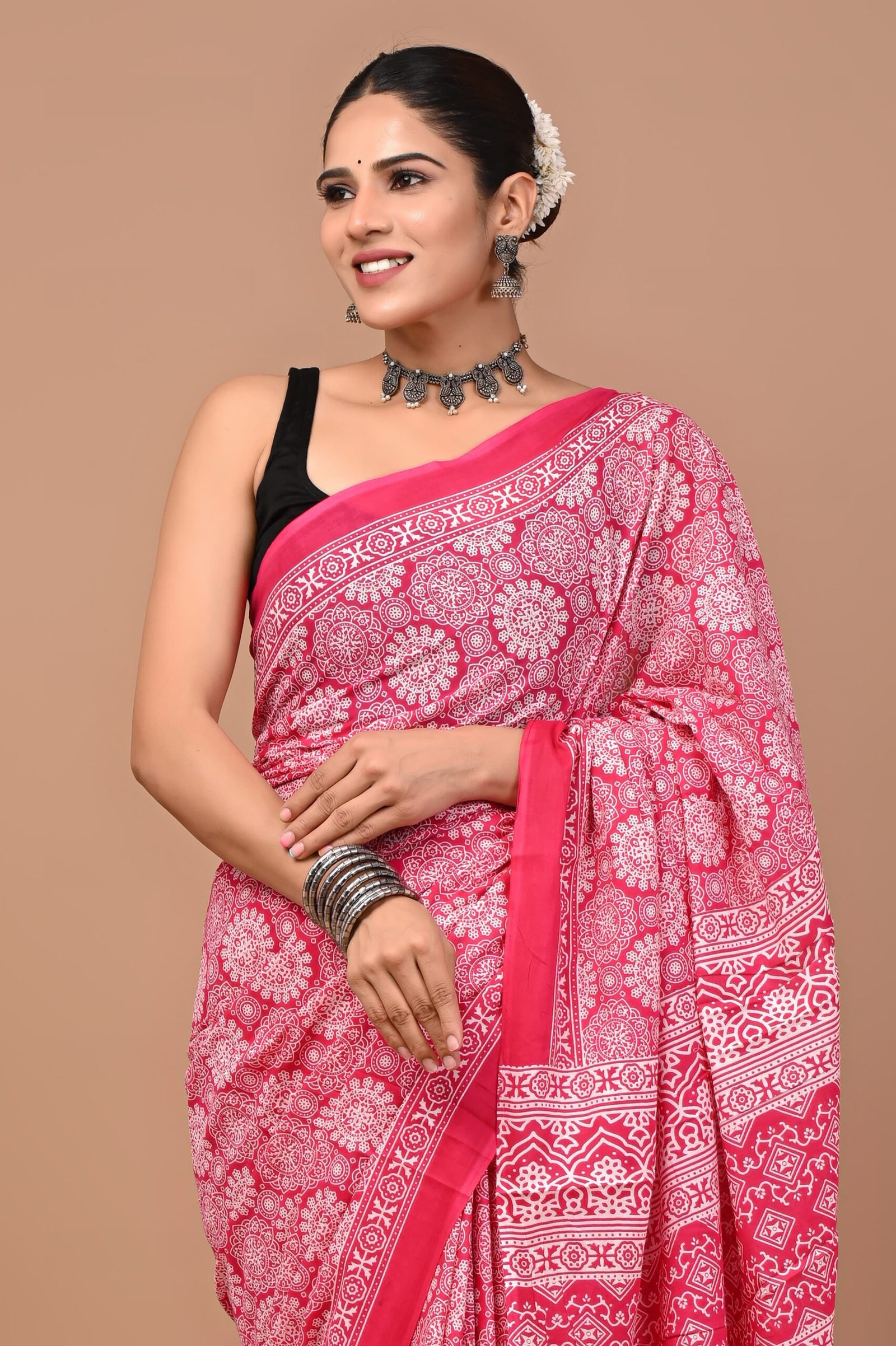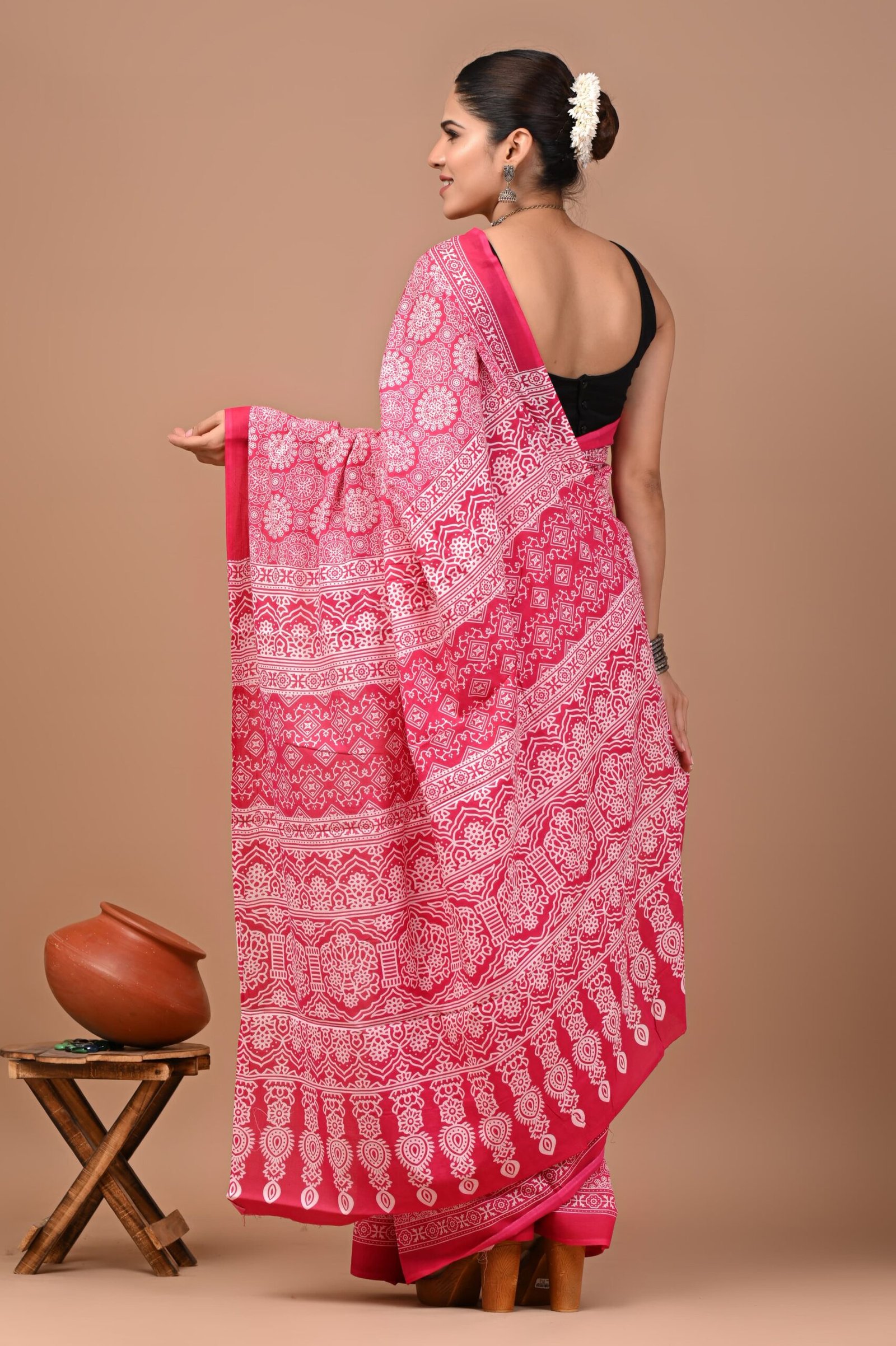 Graceful rani pink cotton saree adorned with timeless hand block prints – lightweight, comfy, and effortlessly stylish.