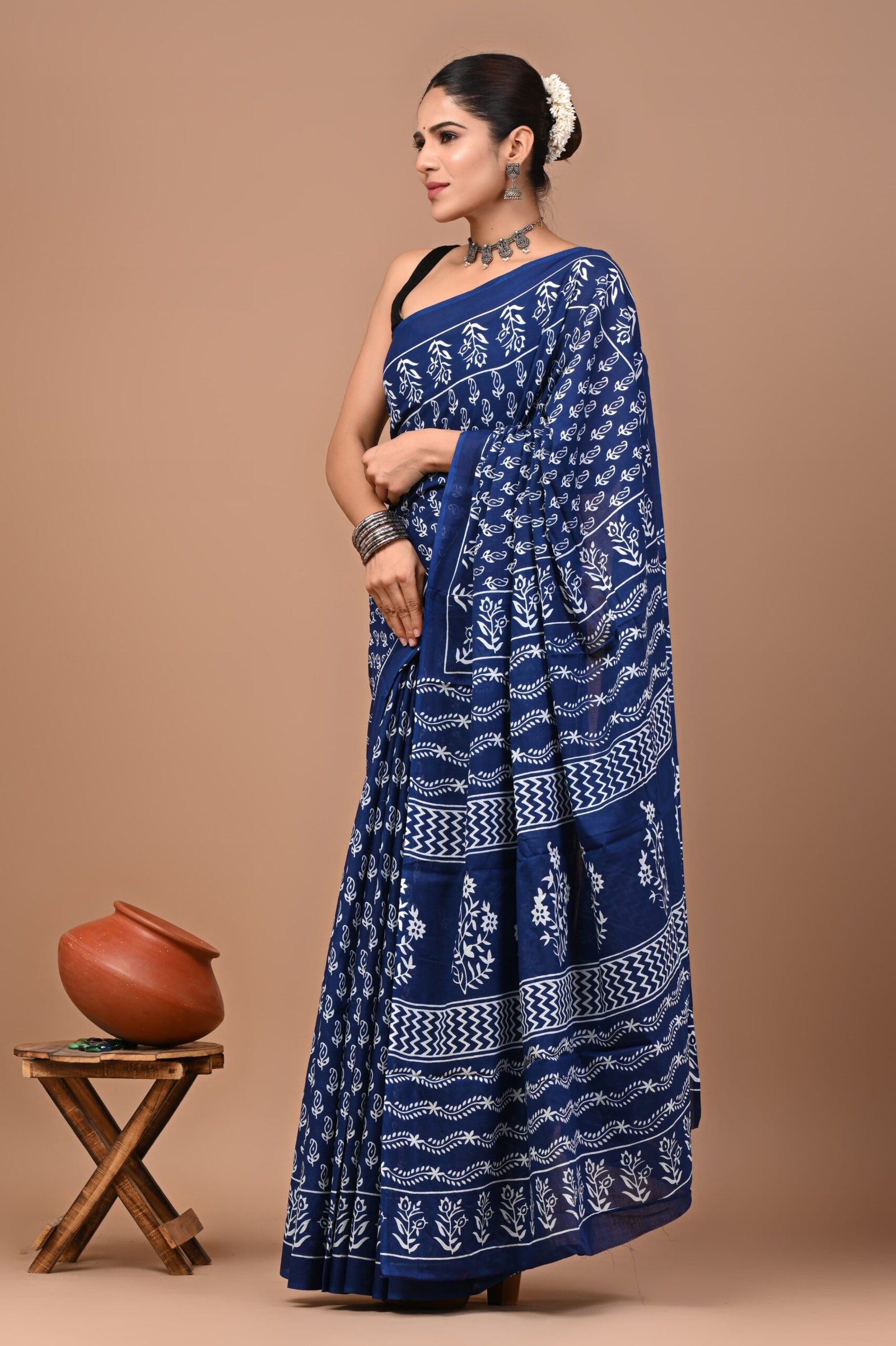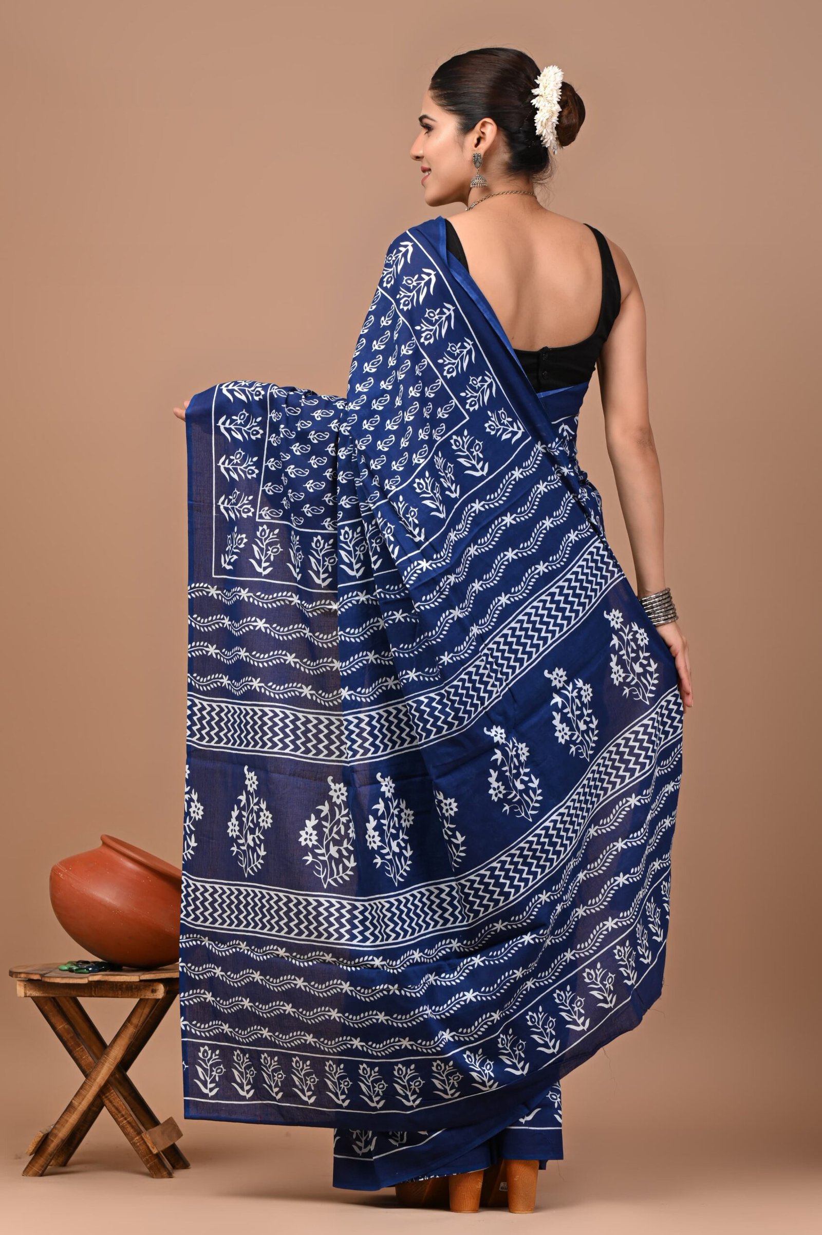 Indigo blue cotton saree with white hand block floral prints – soft, breathable, and perfect for everyday elegance