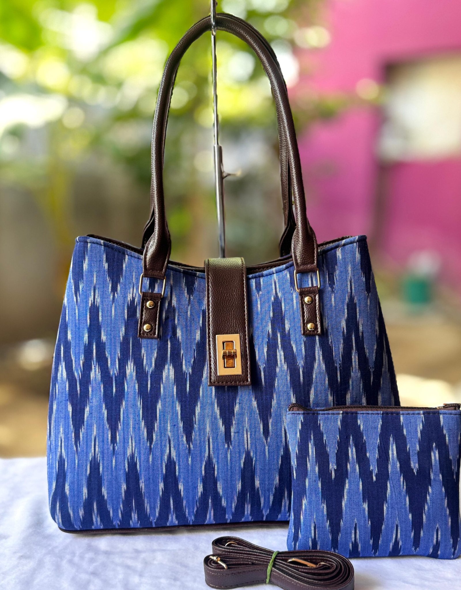 Elevate your everyday style with the Indigo Ikat Elegance Tote Set, inspired by timeless handloom patterns. Featuring a striking blue ikat design, this tote combines traditional artistry with modern sophistication. Crafted from premium canvas and accented with durable leatherette handles and a secure front buckle, it offers both functionality and flair. The set includes a matching zippered pouch and a detachable sling strap, making it versatile enough for work, travel, or daily errands.
