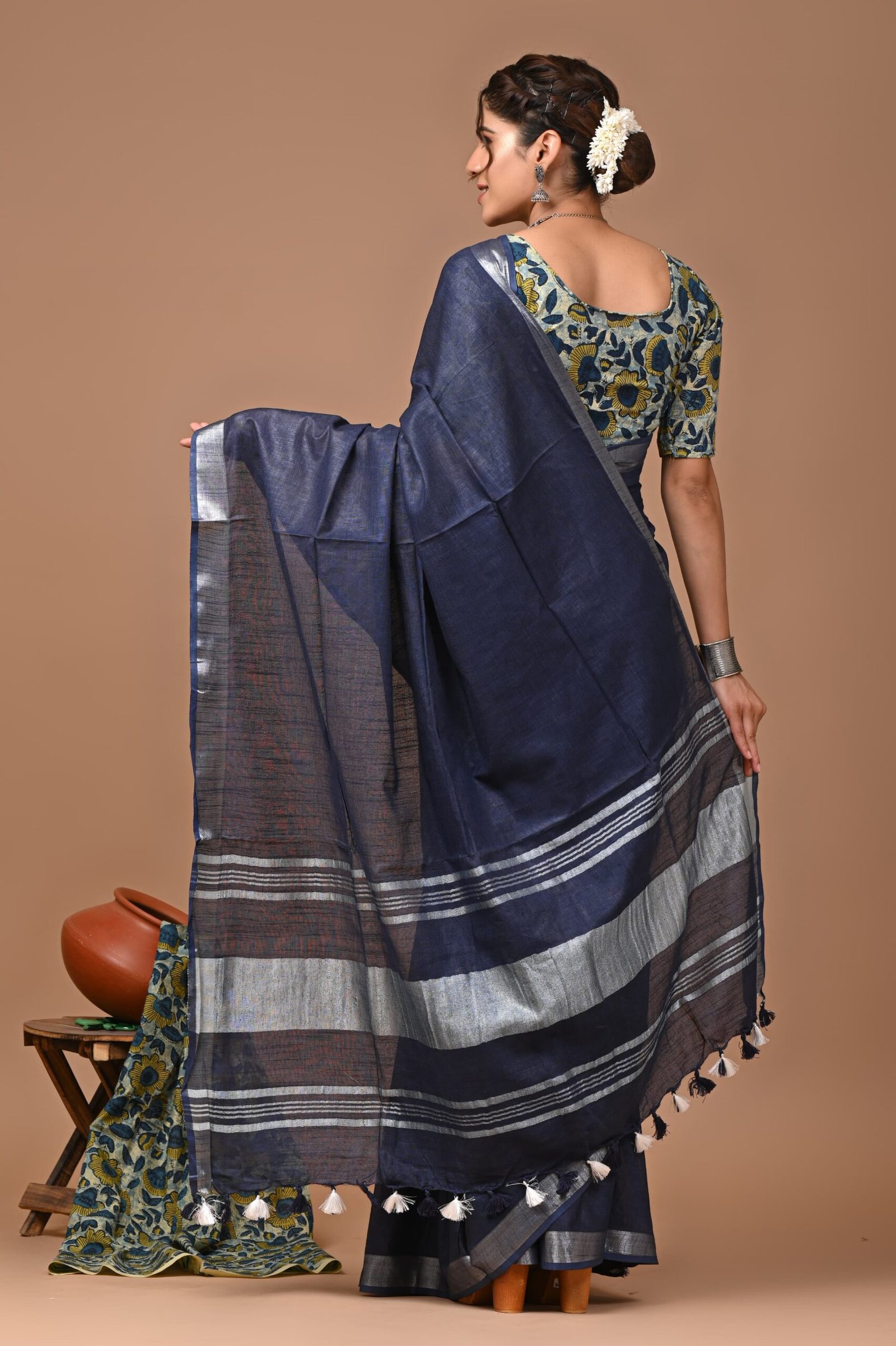 Navy blue cotton saree with silver zari pallu and tassels — classic, breathable, and effortlessly elegant.