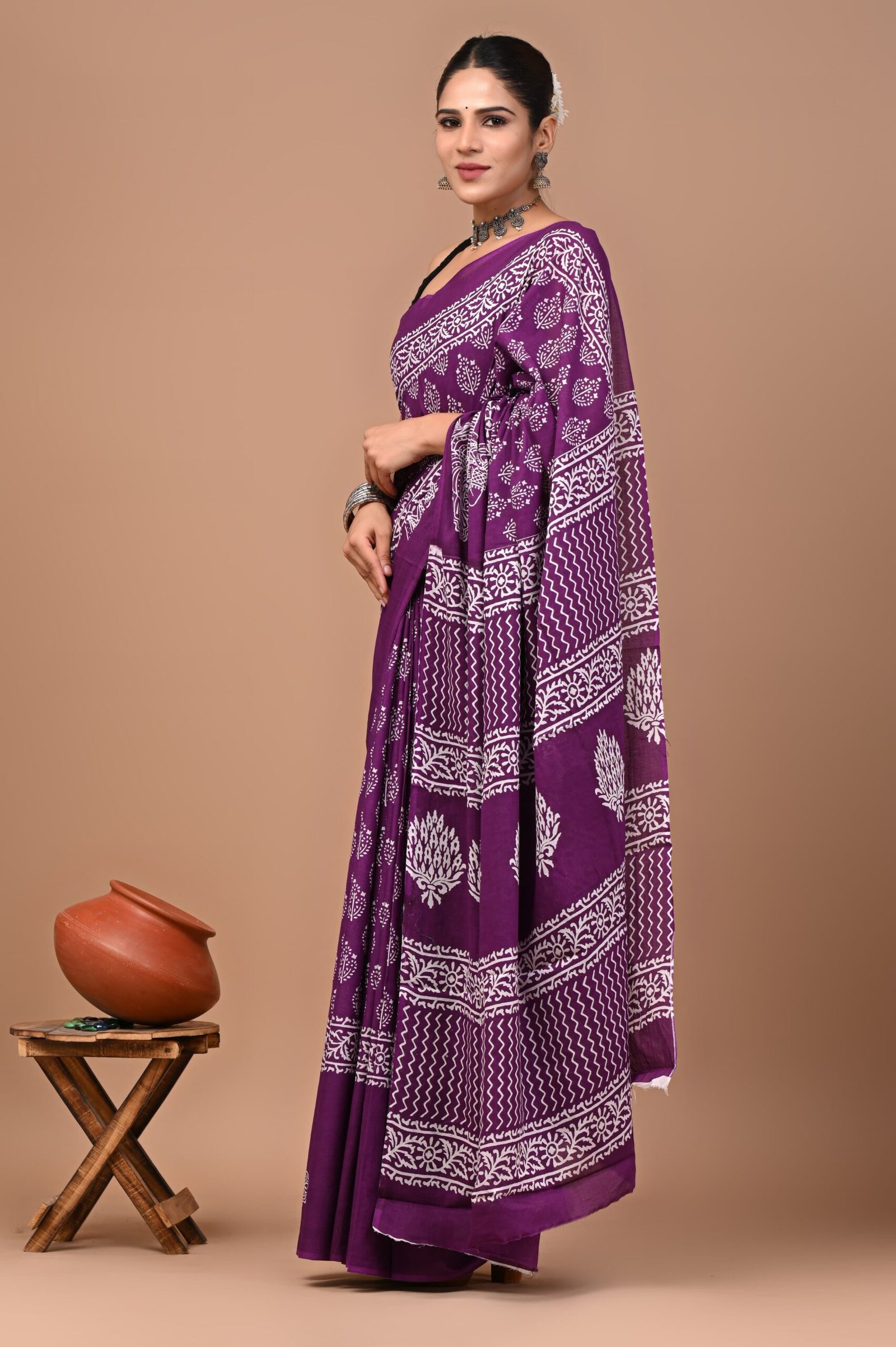 Elegant purple cotton saree with white hand block floral and geometric prints – lightweight, breathable, and perfect for graceful everyday or festive wear