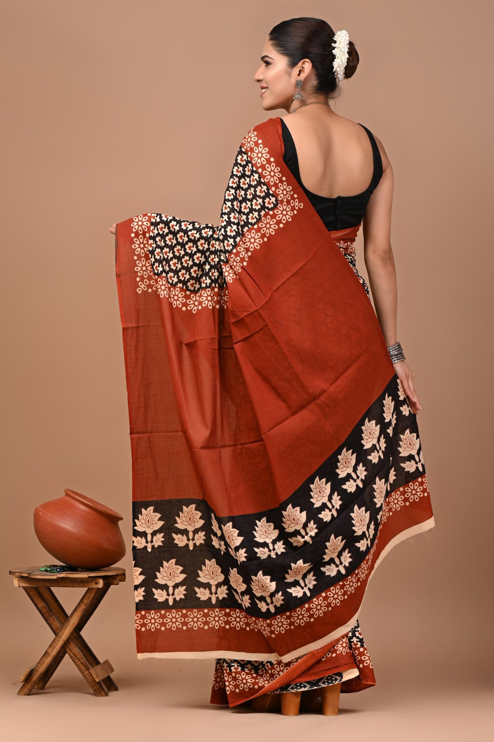 Stylish rust & black cotton saree with handcrafted white block prints – lightweight, comfy, and perfect for everyday elegance