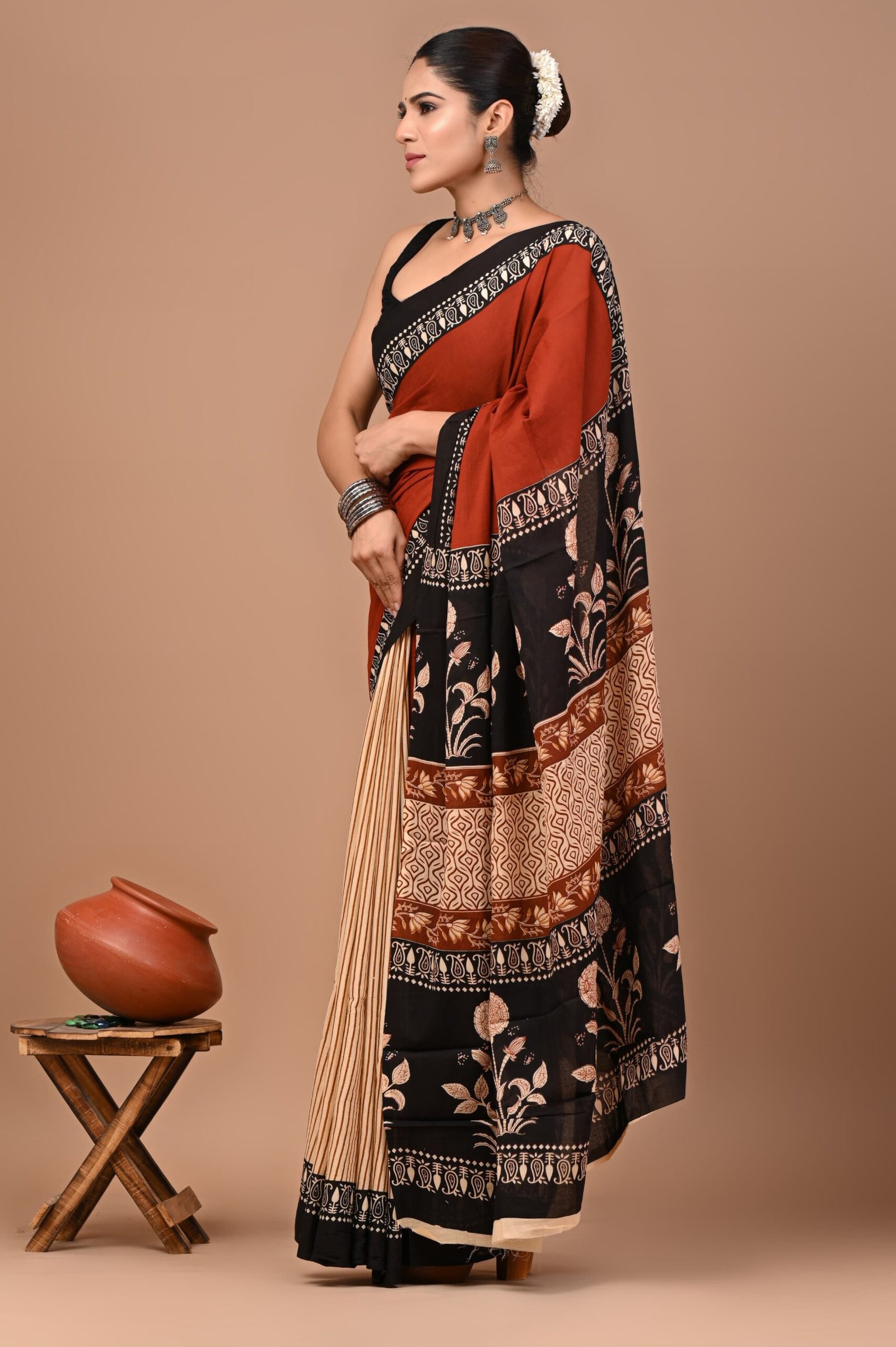 Rust Heritage Cotton Saree with Black & Cream Traditional Block Prints