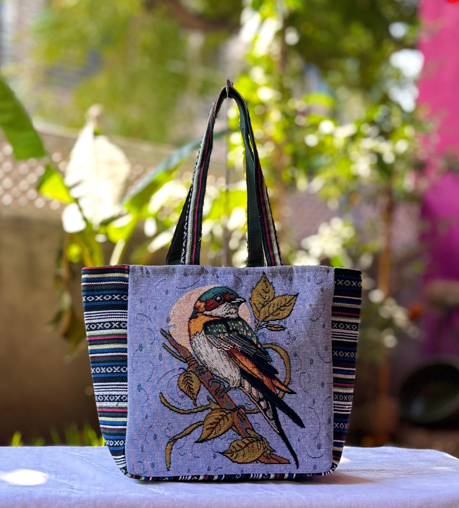 Capture the gentle essence of nature with the Songbird Serenity Tote, a beautifully handcrafted bag featuring a vibrant embroidered bird perched delicately on a branch. Set against a soft lavender-blue background with detailed raindrop-like accents, the design evokes peace and elegance. The striped ethnic side panels and sturdy handles enhance its artisanal appeal. Made from durable, eco-friendly fabric, this tote is perfect for everyday errands, nature outings, or as a charming gift for bird lovers and eco-conscious shoppers.