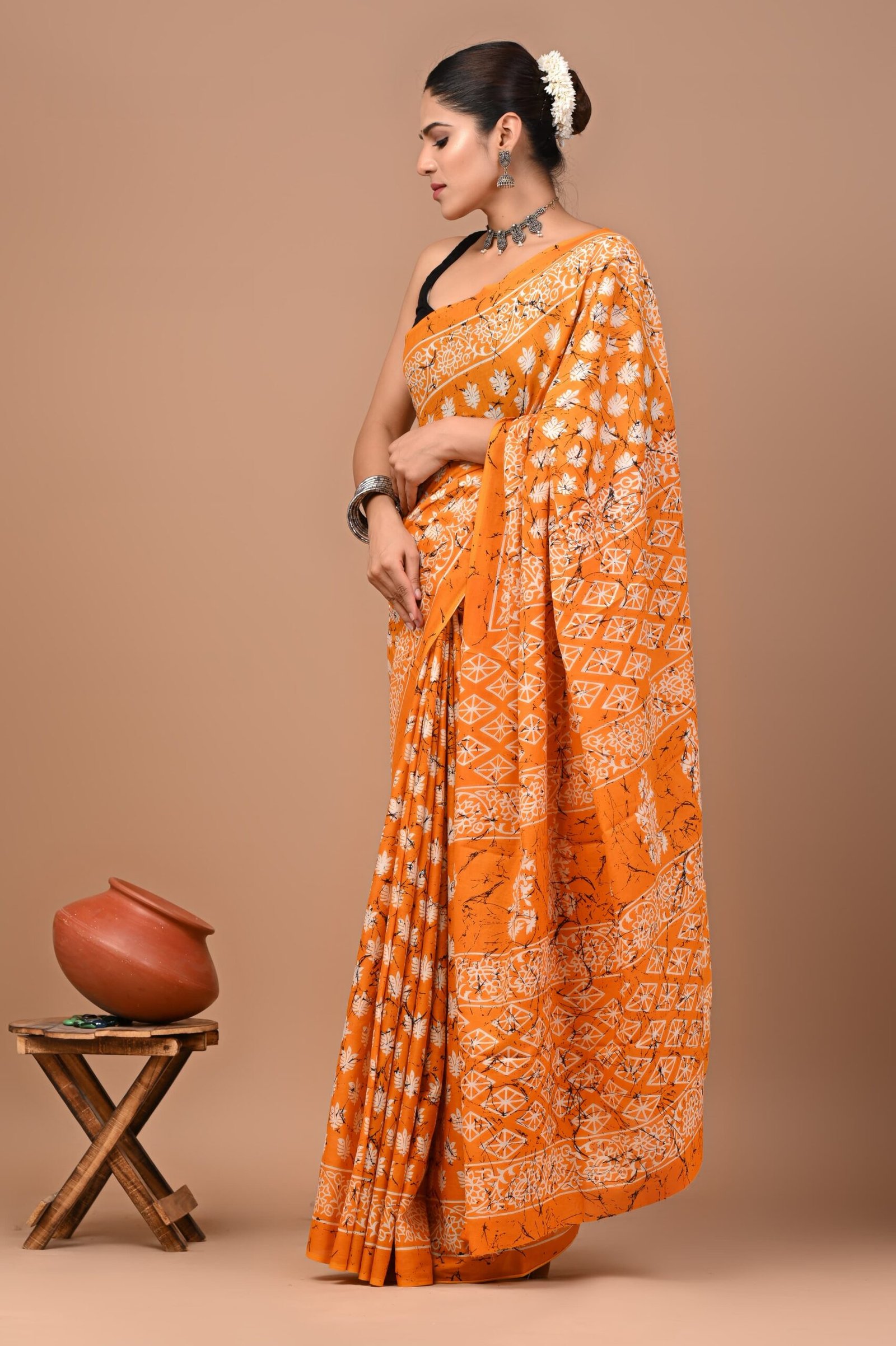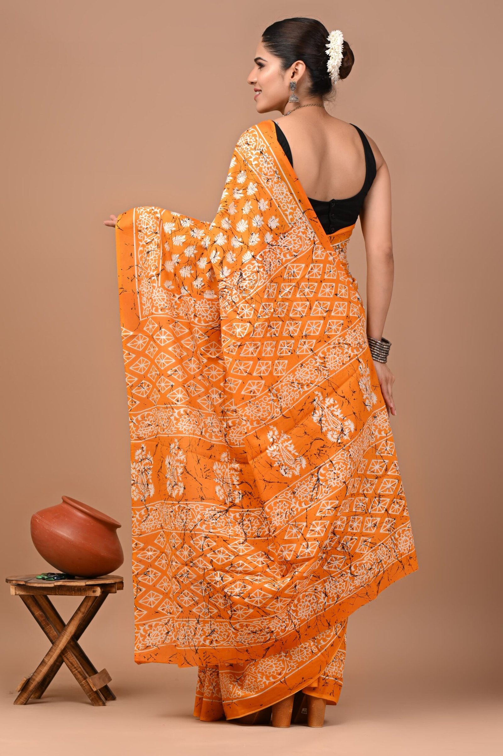 Vibrant orange cotton saree with handcrafted white Dabu prints – lightweight, breathable, and perfect for festive or everyday elegance