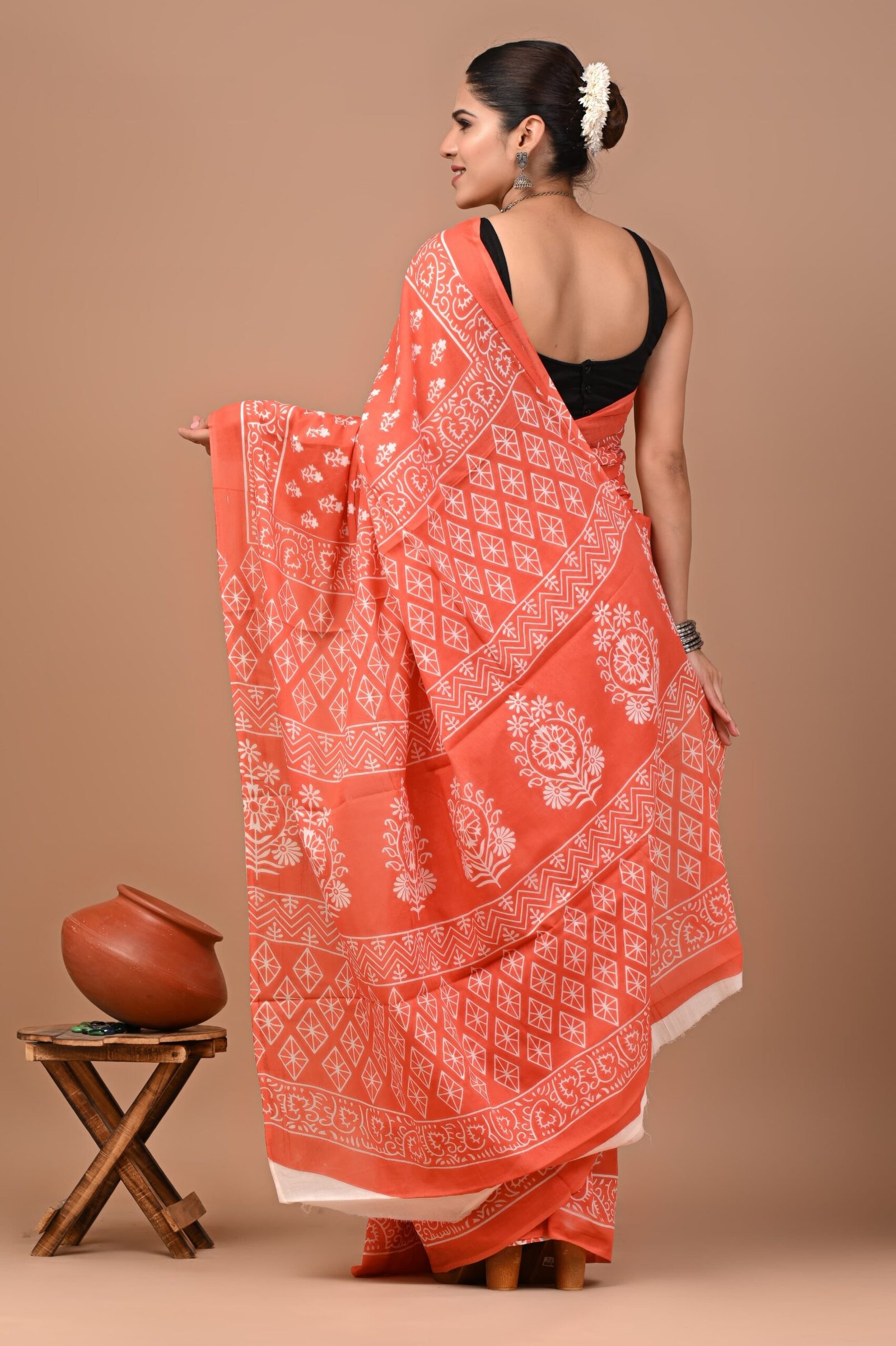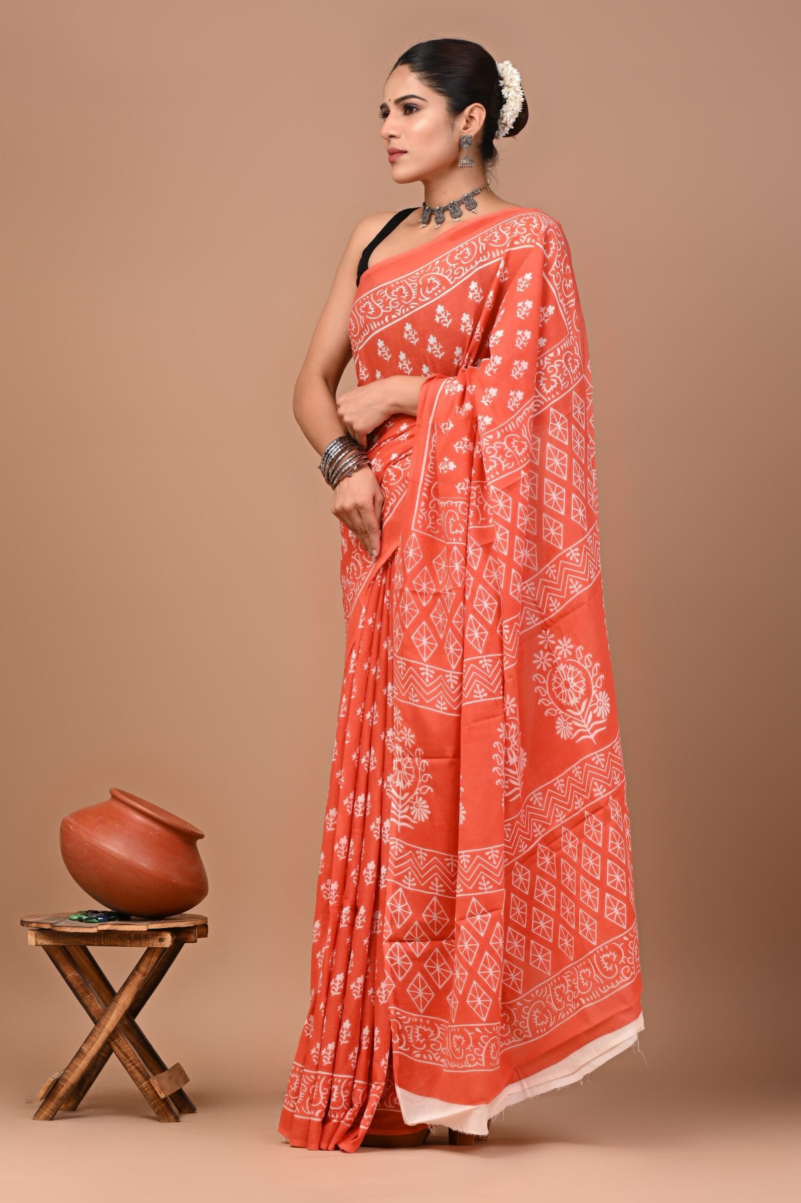 Elegant terracotta cotton saree with traditional Bagru print – soft, breathable, and effortlessly stylish.